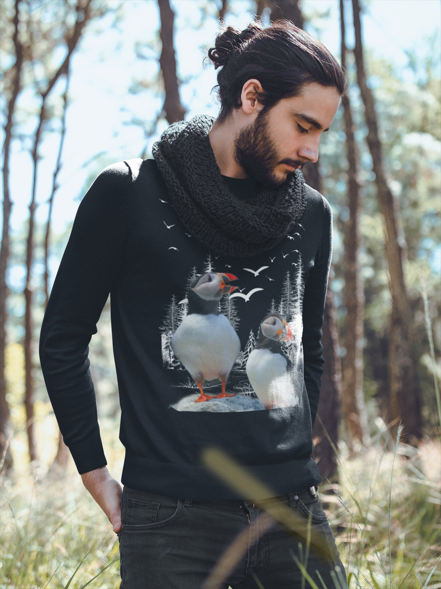 elebrate the beauty of Arctic wildlife with the Winter Puffin Sweatshirt. Featuring an adorable illustration of puffins amidst a snowy backdrop with flying birds and serene winter trees, this sweatshirt exudes charm and warmth. Crafted from premium, soft fabric, it’s perfect for staying cozy during chilly days while showcasing your love for nature and unique designs. Whether you're enjoying the outdoors or relaxing at home, this sweatshirt combines comfort and style seamlessly. Embrace the Arctic vibe and make a statement this winter!